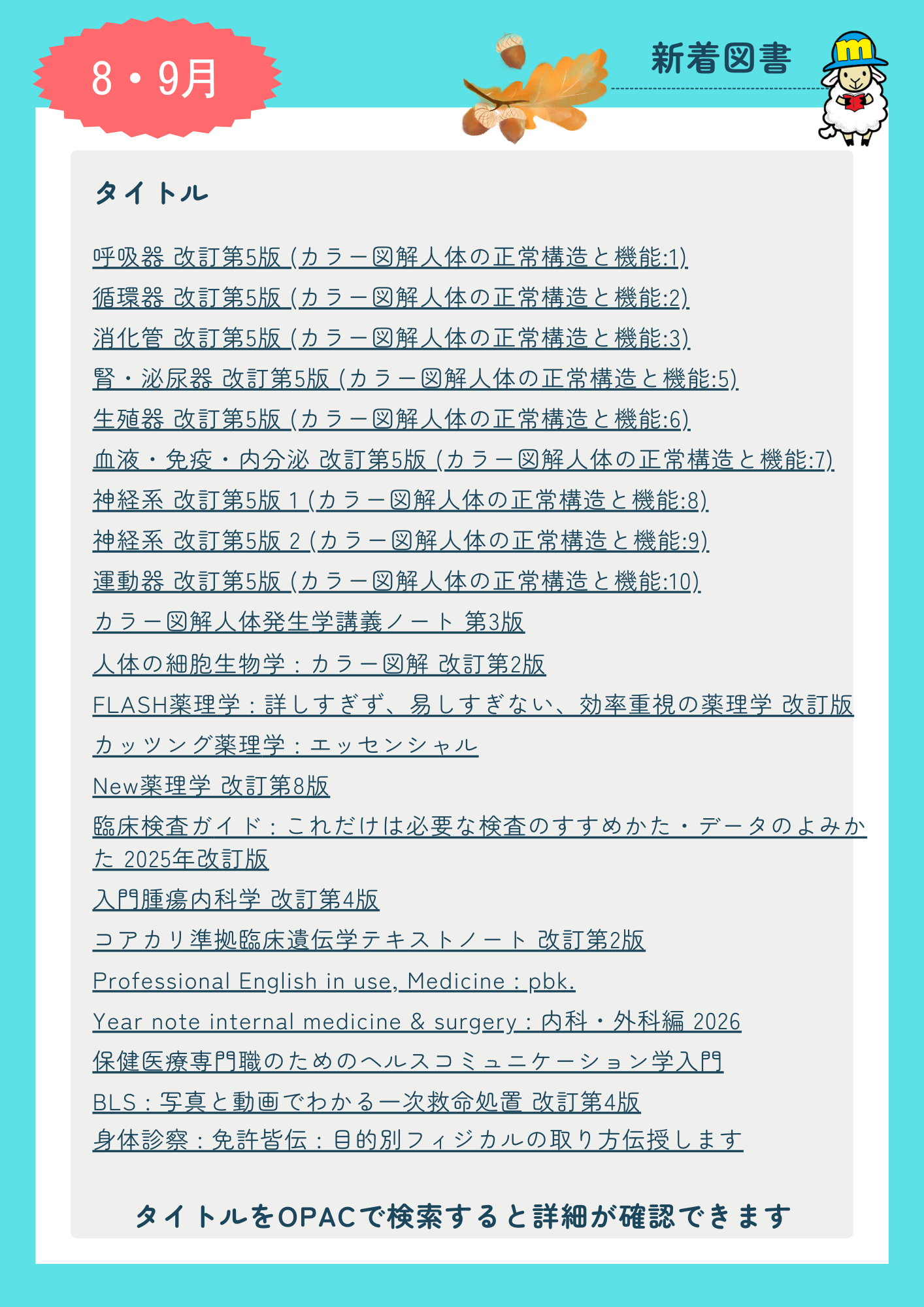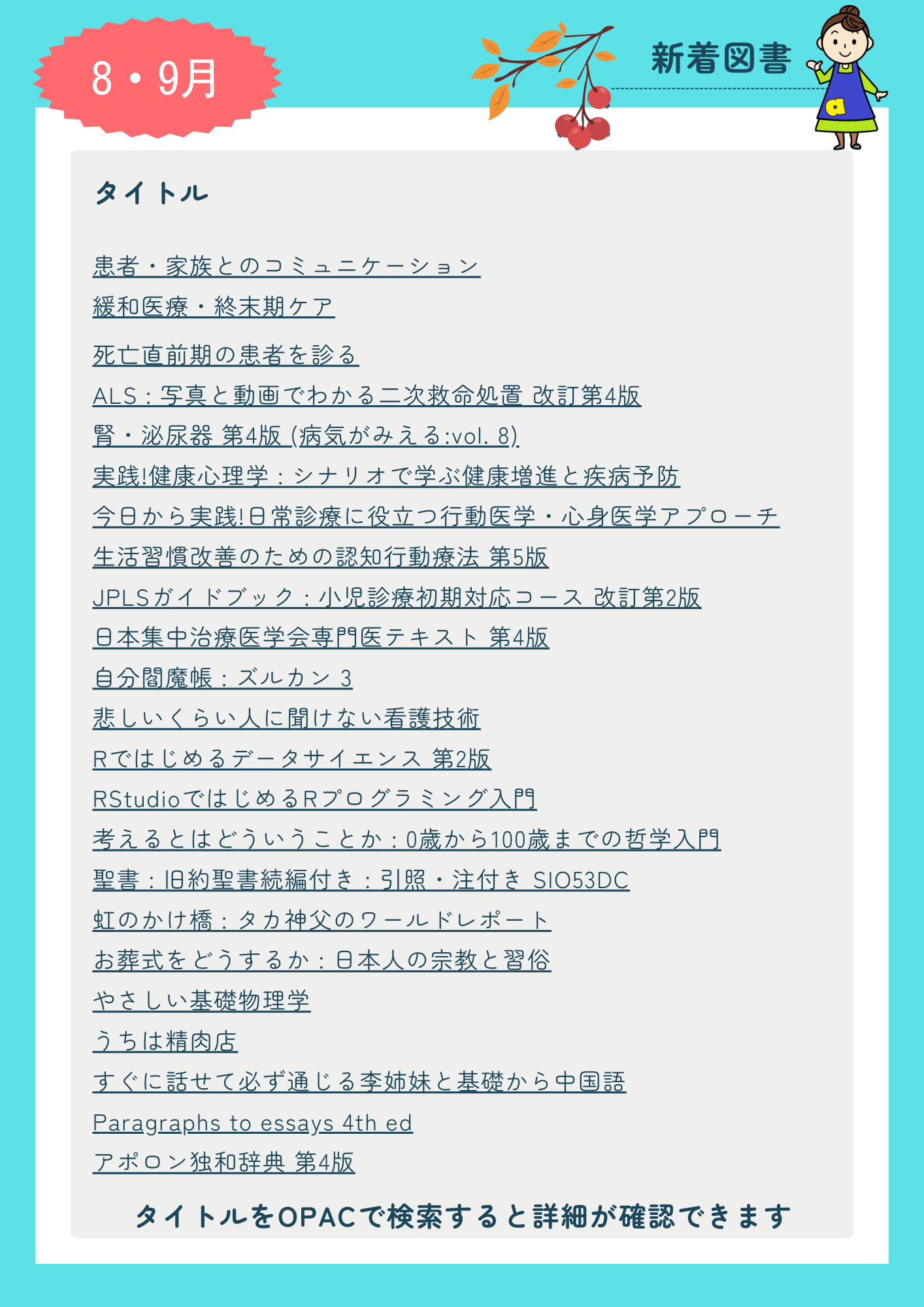 新着図書のご案内です! 教育指針に掲載されている図書が届きました。ぜひご利用ください。------------------------------ 『タイトル一覧』 ------------------------------ ●センター所蔵の図書・雑誌・電子資料をまとめて探す 【あるかもサーチ】 ●センター所蔵の図書・雑誌(冊子体)のみを探す 【OPAC】 ●その他、文献・資料を探す 「文献・資料を探す」ページを参照ください お知らせ